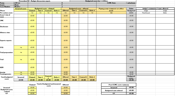 - Precedent ZR or “simplified budget discussion report” – A Budget Discussion Report for parties to compare and discuss costs budgets